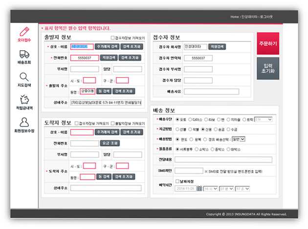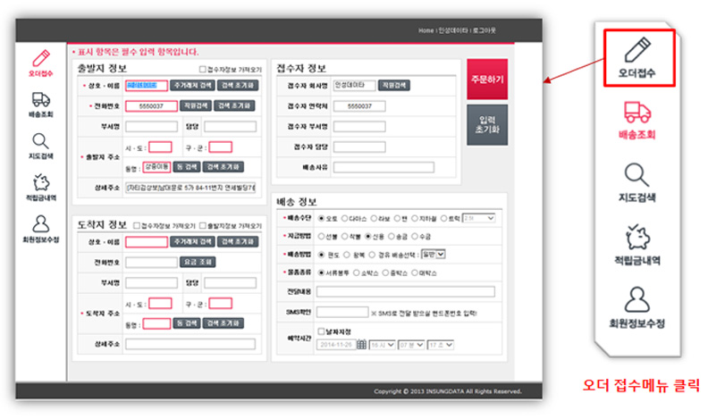 ③출발지정보는 로그인시 접수자 정보가 바로 입력되어 있으며 도착지정보에는 동명을 입력하시고 배송정보에는 배송할 내역 및 배송방법 전달내용등의 상세내역을 선택 및 입력하여 주문하기 버튼을 클릭합니다.