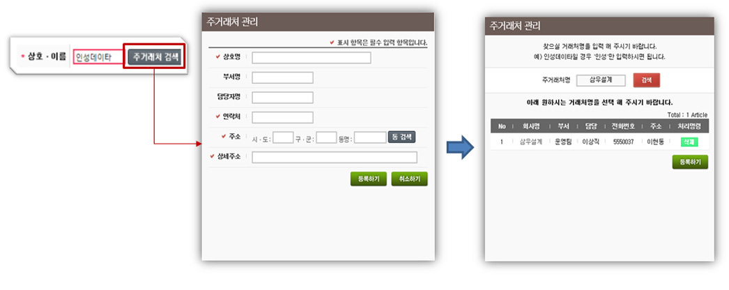 ①주거래처 검색은 사용자가 자주 이용하는 거래처를 등록하여 입력된 거래처 선택시 출/도착지에 정보를 입력할 수 있는 기능입니다.