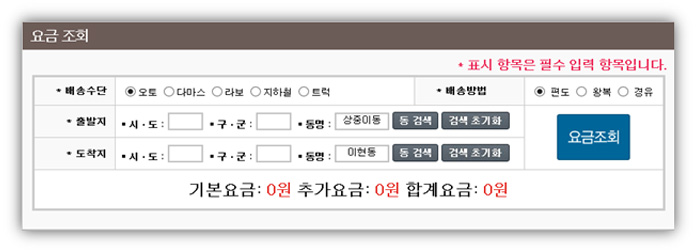 출/도착지 동검색을 클릭한 후 요금조회를 선택하면 요금이 표시됩니다.
