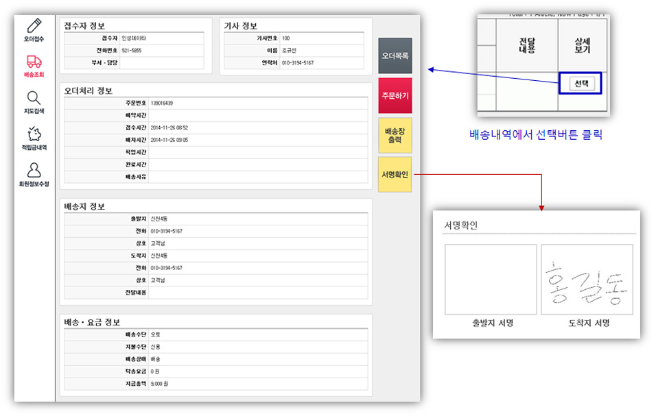 ②상세 항목에서는 다시 주문창으로 돌아가는 주문하기 버튼 , 배송장 출력, 서명확인등이 가능합니다.