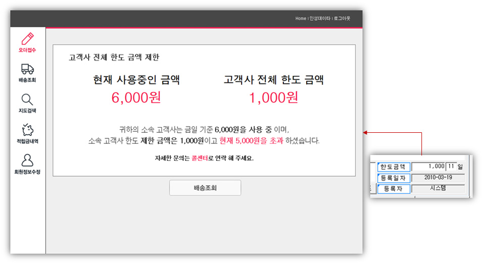 ①콜센터에 거래처관리에 한도금액이 설정되어 있으면 일정한도가 넘은 거래처(고객)은 더 이상 오더를 올리실 수 없습니다.
